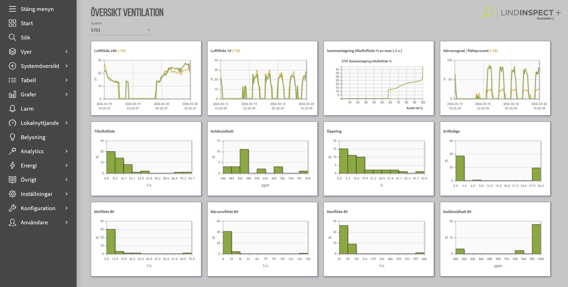 • Systemöversikter för ventilation, temperatur, belysning och solavskärmning